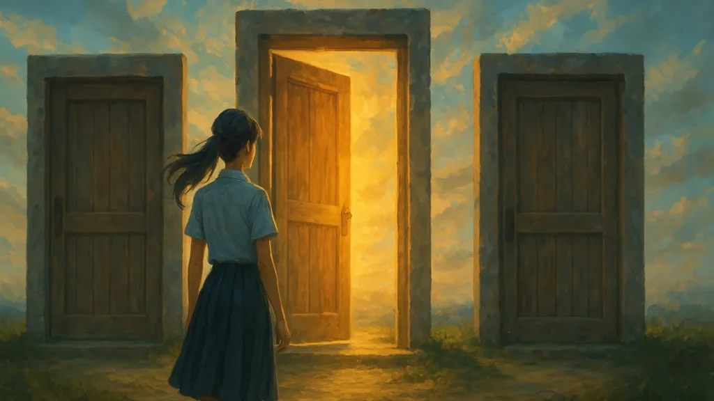 3. Futuro e responsabilidade: a terceira porta aponta escolhas que mudam trajetórias. Essa porta mostra consequência e esperança ao mesmo tempo.
